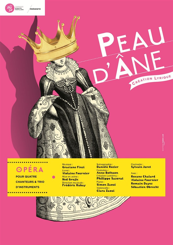 Piano Simon Zaoui, clarinette Sylvain Juret, violoncelle Clara Zaoui. Avec Peau d'Âne, Roxane Chalard ; Le Roi, Romain Dayez; La Reine / la Fée, Violaine Fournier ; Le Prince, Sébastien Obrecht.