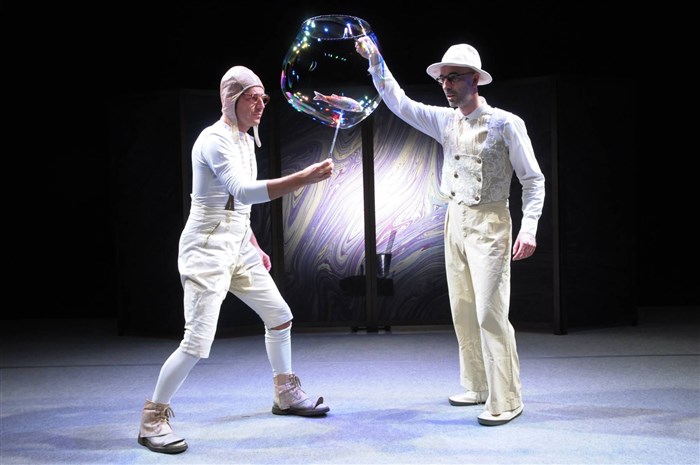 Sur scène, deux drôles de personnages apprivoisent sans un mot le monde des bulles, les domptent, avec espièglerie. Leurs artifices : de l'eau, du savon, des cerceaux, des tuyaux, des machines soufflantes et un éclairage savamment dosé. Une bulle, dix bulles, mille bulles... en un geste les deux héros de cette merveille de théâtre visuel métamorphosent la réalité en une féérie.