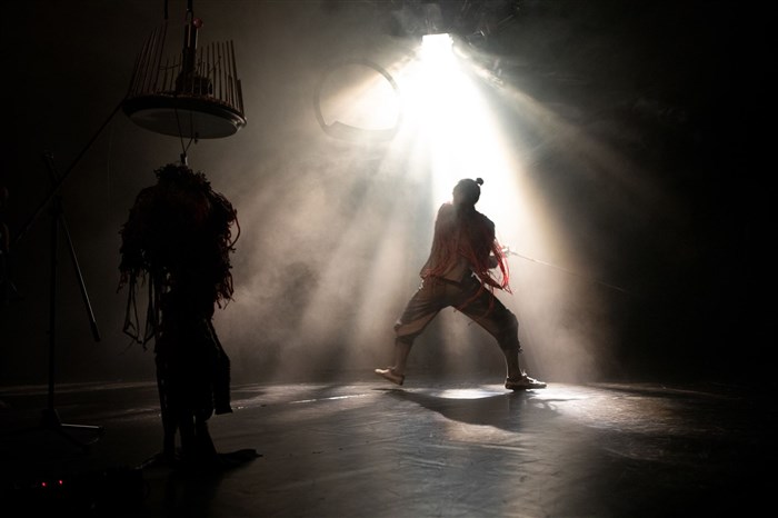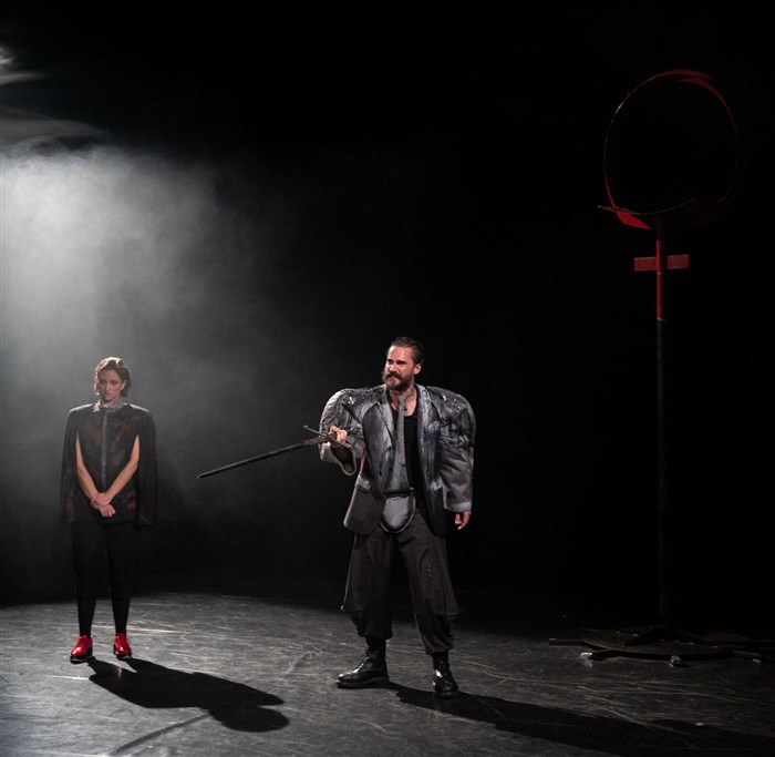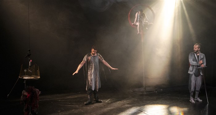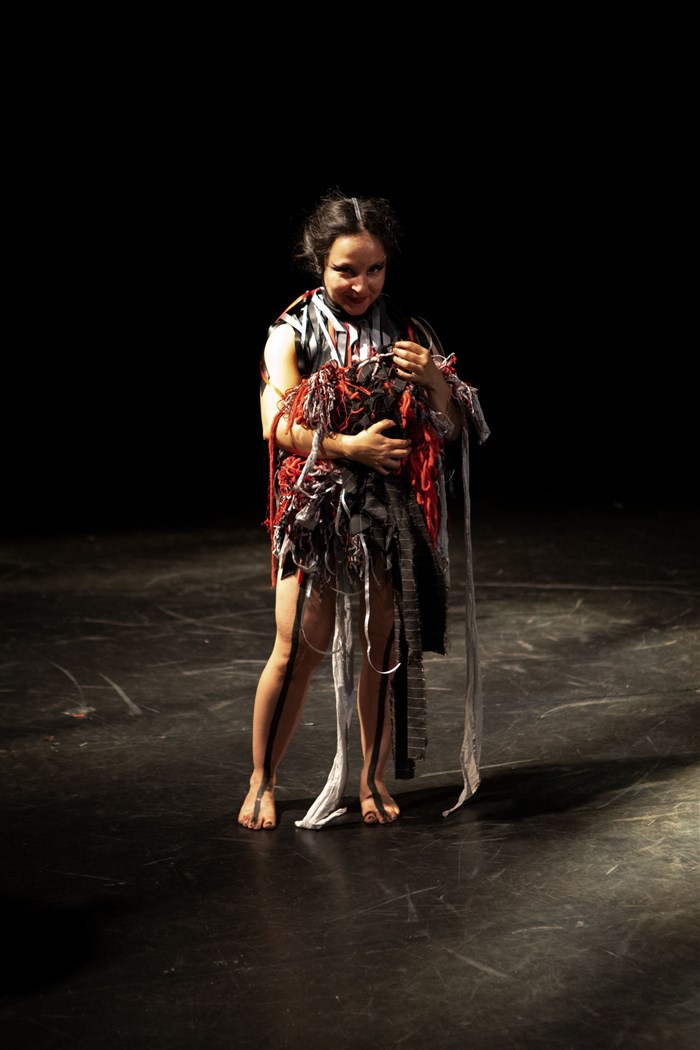 Tantôt acrobate perchée sur son mât, tantôt musicienne dissimulée dans le public, la déesse actionne les rouages de la tragédie, et piège les personnages entre désir, honte, aveu, jalousie et vengeance.