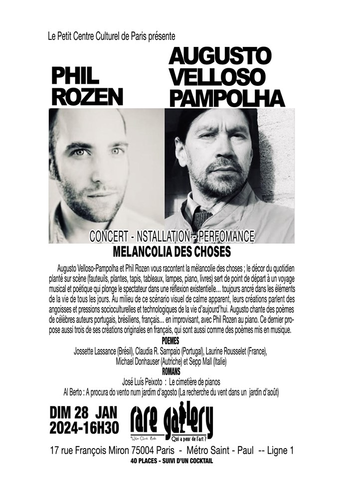 Augusto Velloso-Pampolha et Phil Rozen vous racontent la mélancolie des choses ; le décor du quotidien planté sur scène (fauteuils, vases, tapis, tableaux, lampes, piano, livres) sert de point de départ à un voyage musical et poétique qui plonge le spectateur dans une réflexion existentielle... toujours ancré dans les éléments de la vie de tous les jours. Au milieu de ce scénario visuel de calme apparent, leurs créations parlent des angoisses et pressions socioculturelles et technologiques de la vie d'aujourd'hui. Augusto chante des poèmes de célèbres auteurs portugais, brésiliens, français... en improvisant, avec Phil Rozen au piano. Ce dernier propose aussi trois de ses créations originales en français, qui sont aussi comme des poèmes mis en musique.