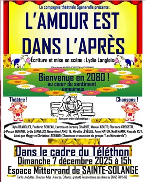 Coucou tout le monde ! A l'occasion de la fête du Téléthon le dimanche 7 décembre 2025, nous vous souhaitons, à l'avance, un bienheureux après-midi de théâtre, de chansons et de danses dans le bel espace culturel de Sainte-Solange ! Venez nombreux prendre l'air du bonheur, au cours d'une envolée solaire vers l'année 2080 ! Le spectacle sera pimenté de rythme, mais aussi de douceur, afin de câliner votre coeur, et le remplir de rires à partir de 15h !