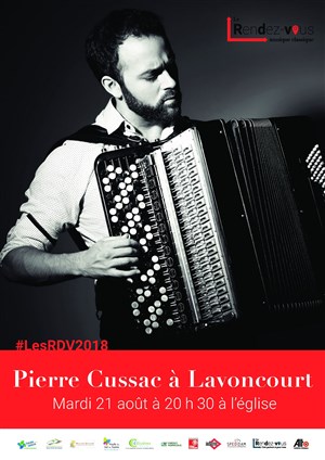 Pour ce Rendez-vous 2018, Pierre Cussac nous propose un programme éclectique mêlant répertoire classique, jazz, et improvisation. Il fait sonner son accordéon dans des registres singuliers grâce auxquels nous redécouvrons cet instrument populaire par excellence à travers des sonorités inattendues que Pierre Cussac parvient à nous faire entendre. Chaque soir, l'artiste vous donne rendez-vous à 20 h 30 dans une église du département pour un récital suivi d'un pot convivial avec le musicien et l'équipe du festival.