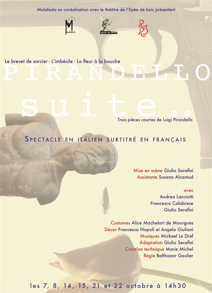 Un spectacle composé de trois pièces courtes, trois chefs-d'oeuvre du maître sicilien Luigi Pirandello : Le brevet de sorcier, L'imbécile, Les fleurs à la bouche.