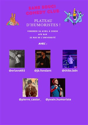 Sans Souci Comedy présente de nouveau un plateau d'humoristes à AFK Bar ! Des comédiens, chacun avec un univers différents, vont se succéder sur scène pour vous faire rire et passer un bon moment !