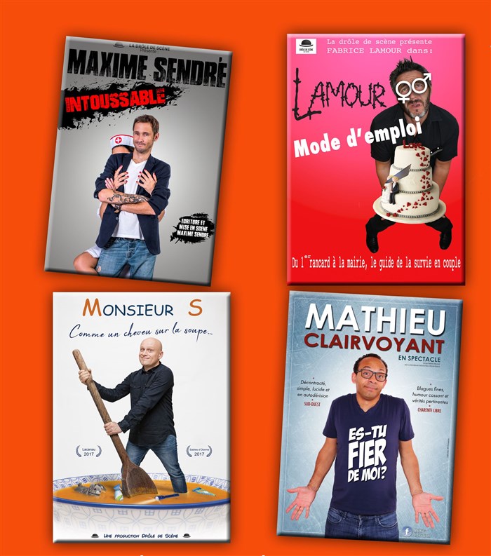 Maxime Sendré, Monsieur S, Mathieu Clairvoyant et Fabrice Lamour : chacun avec un univers différent, tous ont une grande habitude de la scène, ils vous feront passer la plus drôle des soirées !