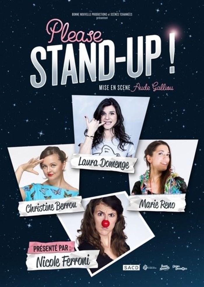 Please Stand-Up ! est un spectacle avec des extraits de seules en scènes et des sketches chorales inédits écrits pour l'occasion. Il n'y a pas d'humour féminin mais il y a des femmes qui font l'humour.