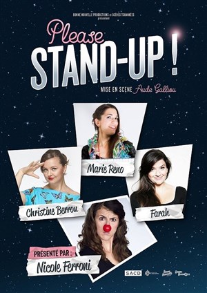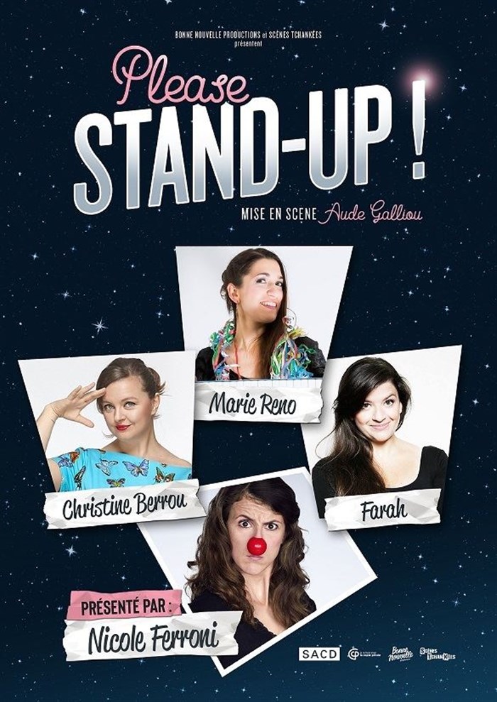 Please Stand-Up ! est un spectacle avec des extraits de seules en scènes et des sketches chorales inédits écrits pour l'occasion. Il n'y a pas d'humour féminin mais il y a des femmes qui font l'humour.