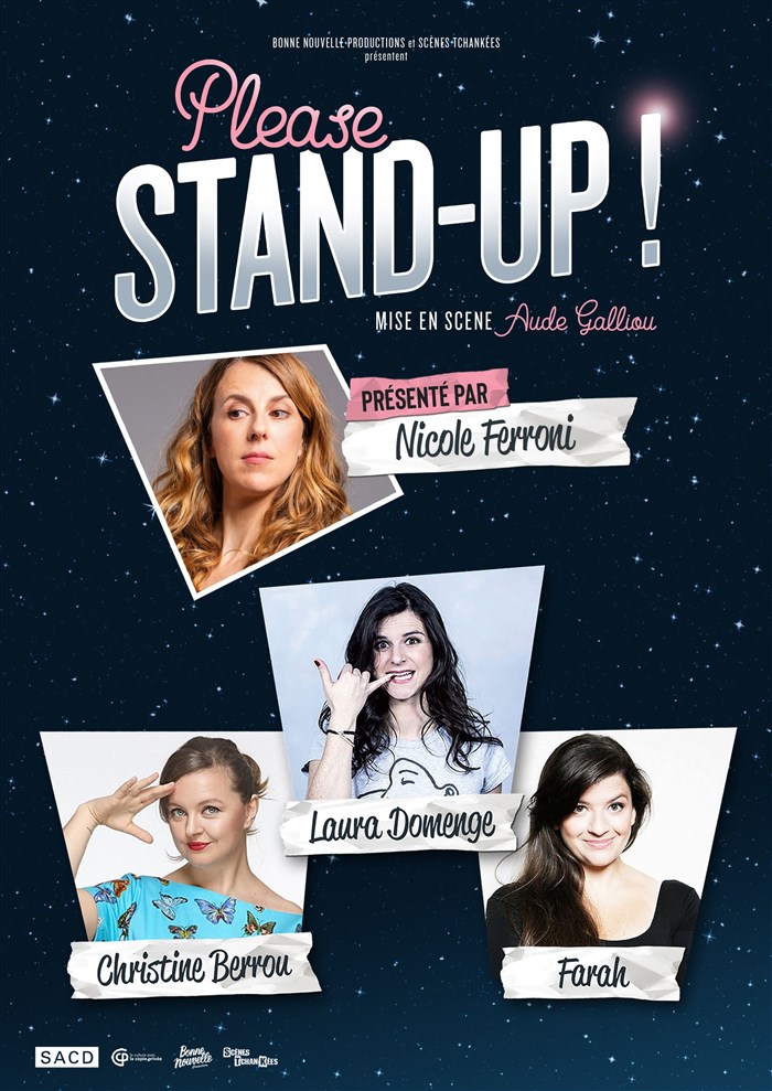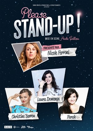 Please Stand-Up ! est un spectacle avec des extraits de seules en scènes et des sketches chorales inédits écrits pour l'occasion. Il n'y a pas d'humour féminin mais il y a des femmes qui font l'humour.