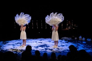 Le silence est peu à peu rompu par un rythme sec et épuré, un battement intrigant. Apparaît un personnage vêtu de blanc coiffé d'une plume blanche. Un autre est dans la pénombre, une guitare bleue dans ses mains. Tout près, un corps allongé sur le sol laisse progressivement place à un étrange animal... Dans une scénographie inspirée par la plasticienne irlandaise Claire Morgan, des suspensions organiques aériennes faites d'une multitude de plumes nous plongent dans un monde onirique. Un moment doux comme la découverte des émotions au théâtre.