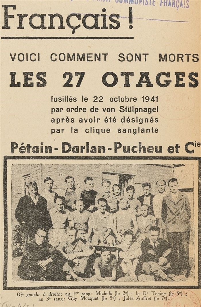 Le 22 octobre, en début d'après-midi, un officier allemand, assisté d'un lieutenant français, procède à l'appel des otages. Parmi eux, Guy Moquet, 17 ans, Jean-Pierre Timbaud, 37 ans et un professeur de français d'origine vietnamienne, Huynh Khuong An, 29 ans. Une dernière lettre à leurs proches et les voilà transportés en camion jusqu'à la carrière de la Sablière, à deux kilomètres du camp, lieu de leur exécution. Là sont plantés 9 poteaux et 90 soldats allemands. Tous refuseront de se faire bander les yeux et mourront en chantant la Marseillaise.