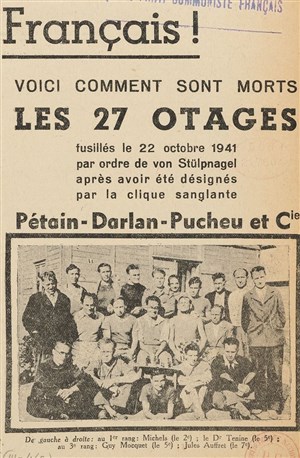 Les Allemands offrent 15 millions de francs à toute personne qui contribuerait à la découverte des coupables. En vain. À Paris, le général Otto von Stülpnagel, chef de l'administration militaire d'occupation, décide alors de faire exécuter 50 otages pour l'attentat de Nantes en application de l'ordonnance du 28 septembre, dite "code des otages". Le général choisit 27 noms sur une liste de 61 détenus du camp d'internement de Choisel-Châteaubriant. La liste lui a été fournie par les services du secrétaire d'État à l'Intérieur Pierre Pucheu, collaborateur du Maréchal Pétain à Vichy.