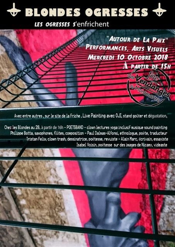 Pour l'ouverture de la fête des vendanges de Montmartre 2018, les clowns, poètes, musiciens, vidéastes de Poets'Band vous réservent une séance de méditation avec le grand Yogi Gove de Crustace, Tristan Felix, une séance sound-painting à un bras, des saxos et des flûtes avec Philippe Botta, textes et imprécations : "Pace salute", "Le monde la vie " Alain Marc, Paul Dalmas-Alfonsi, Isabel Voisin, vidéo : Tags 75018 de Nicamy (extraits).