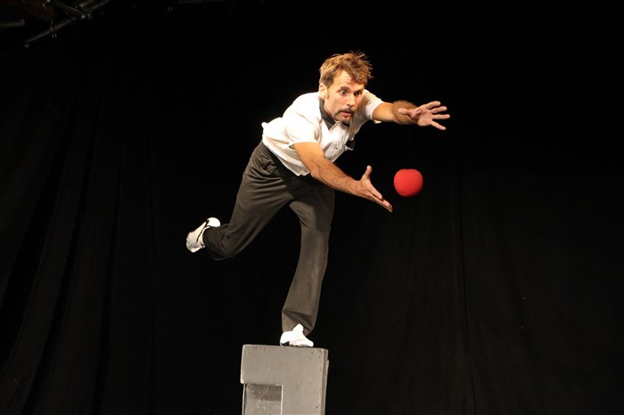 Clown et théâtre d'objet. Sur scène un clown et un objet : un grand livre.