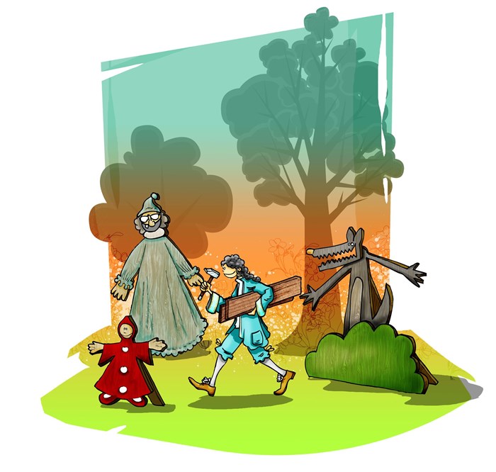 Aidé par un accessoiriste ronchon , il va imaginer un monde qui se crée peu à peu sous les yeux du spectateur, se transforme, s'améliore, malgré un loup récalcitrant qui ne veut pas faire ce que l'auteur lui demande, un chaperon rouge rebelle et une grand mère un peu sourde et acrobate.