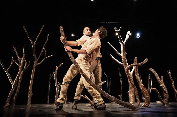 Dans un décor de bois brut, un duo d'acrobates se faufile, s'agrippe et construit une forêt aux équilibres précaires. Un spectacle métaphorique, doux, fluide et rêveur.