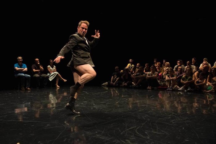 À 50 ans, en slip et cravate ou manteau de fourrure, Olivier Dubois visite en solo quelques-uns des soixante spectacles auxquels il a pris part en tant qu'interprète ou auteur.