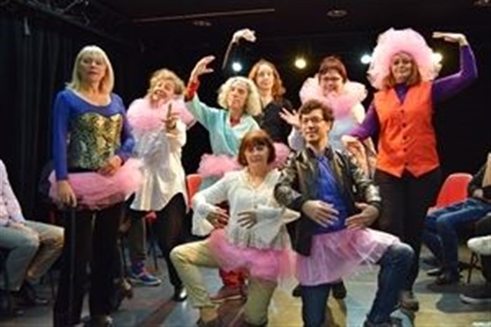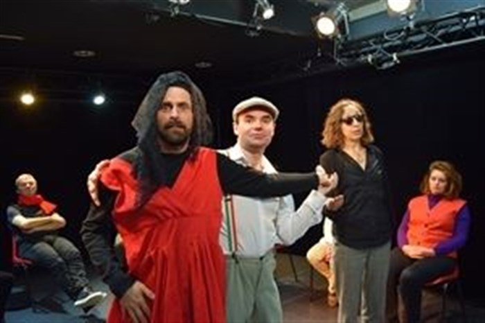 Des chaises, dépareillées, attendent la troupe qui arrive, désordonnée, en bavardant dans l'excitation folle de la représentation qui va suivre. Les interprètes sont là ! Au complet : ceux qui jouent et ceux qui chantent et ceux qui ont les deux casquettes. Les treize sièges (pas de panique, ils ne sont pas à table !) en arc-de-cercle vont signifier la scène nue, devant eux.