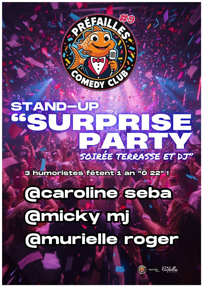 Ce mois-ci place aux effets waouh en tout genre, aux coups de théâtre, aux stupéfaits, à la soudaineté, à l'étonnement, à l'inattendue... Bref place aux Surprise et à la fête ! Surprise Party ! Pour le premier anniversaire de l'ouverture du Ô22, nos artistes véritables snipers de la tchatche vont croquer le monde et ses travers, à pleine dents souvent si bien aiguisées. Tout y passe : la famille, la politique, les médias, les rencontres incongrues, l'amour, les genres, les aventures d'un soir ou celles pour la vie, seul ou a plusieurs, les études, l'argent, la rue, le sport, les chats et autres animaux en tout genre...
