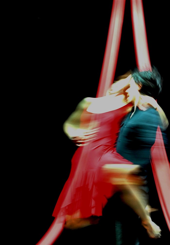 Dans une rivière rouge de tissus, qui se nouent et se dénouent au grè de leurs passions, il nous font vivre un corps à coeur poignant dicté par la prose de Jacques Prévert.