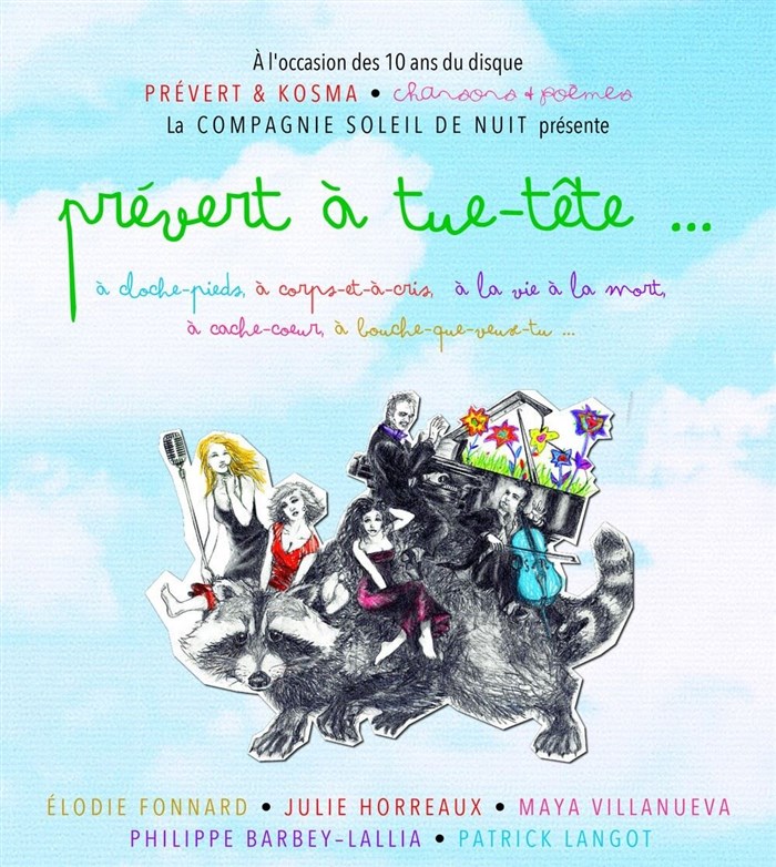 À l'occasion des 10 ans du disque Prévert & Kosma, Chansons & poèmes, la compagnie Soleil de nuit vous présente Prévert à tue-tête et revisite pour vous les chansons de Prévert et Kosma, immenses "classiques" de la chanson française, dans des arrangements inédits pour trio vocal féminin, violoncelle et piano, mêlant classique, jazz et cabaret.