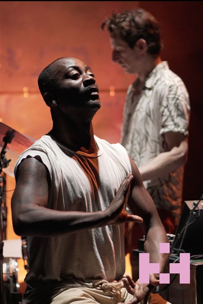 Sur le plateau : une batterie "augmentée", un agencement sonore simple et vivant, en multidiffusion, des lumières audio-réactives, un comédien danseur, un mur du son, quelques phrases codées, et puis la pulsation. Car la danse et le mouvement sont eux-mêmes une partition à part entière ; les sons voyagent au milieu des formes et des matières ; la gravité et la pesanteur racontent le rythme.