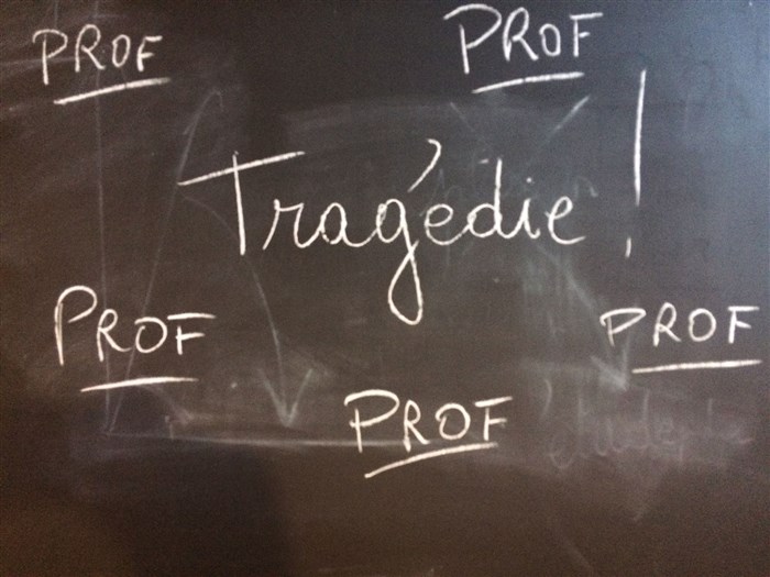 On hallucine, on sourit aussi de cette farce grinçante qui dérange et bouscule sur la fonction d'enseignant. Pour lui, tout se résume dans la diminution de sa fonction de professeur en simple prof, son métier était le plus beau du monde, mais qu'en est-il maintenant avec des élèves qui ne le calculent pas ? Une belle interprétation de Jean-Marie Garandet dans une mise en scène dynamique d'Yves Javault qui a réorchestré cette pièce à l'origine jouée par Jean Piat.
