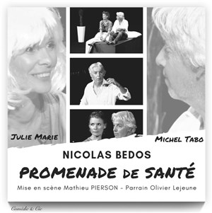 Dernière pièce en date de Nicolas Bedos, et sans doute la meilleure à ce jour, "Promenade de santé" est remarquable. D'une simplicité apparente (deux personnages, décor plus ou moins unique), Bedos va tirer une tragédie qui ne dit pas son nom, une histoire d'amour vouée à l'échec dans un retournement de situation assez inattendu. C'est fin, c'est doux-amer, on rit la gorge nouée, d'un rire gêné...