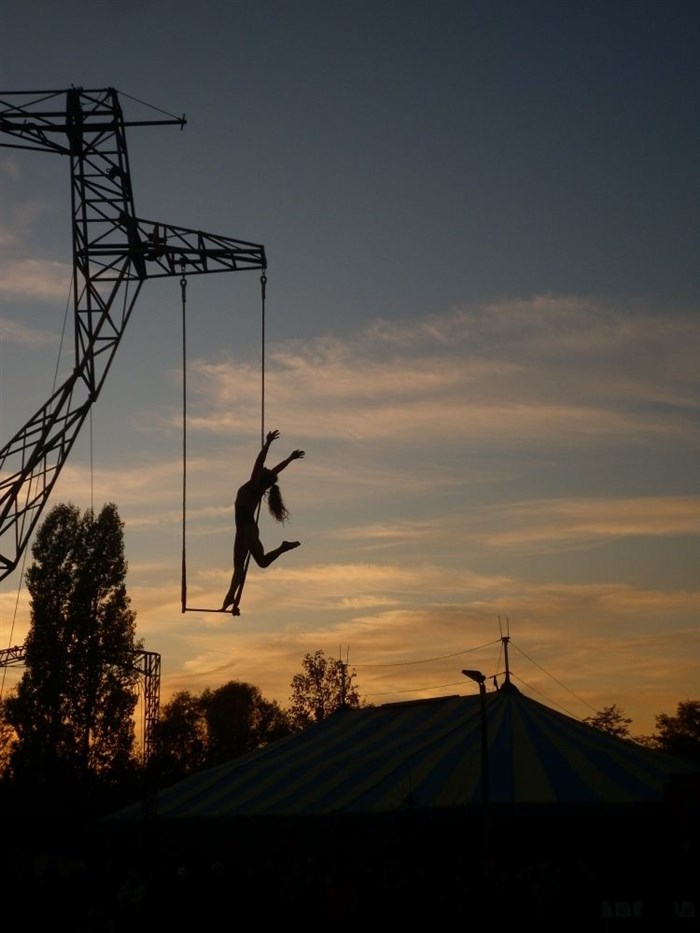 Imaginez un gigantesque pylône sous un chapiteau : quelle surprenante rencontre ! Levez les yeux : les acrobates, funambules en apesanteur, s'élancent dans les airs et prennent leur envol.