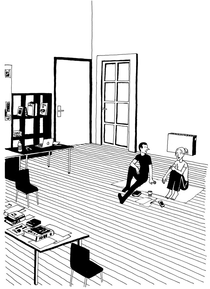 Mathilde Monnier fait des croquis pour préparer ses pièces. François Olislaeger vient de sortir une bande dessinée sur Mathilde Monnier. Il était logique que ces deux-là s'associent pour inventer une pièce commune autour de ce que le dessin saisit le mieux de la danse : la posture des corps, comment ils se tiennent, s'allongent, tombent ou sautent.