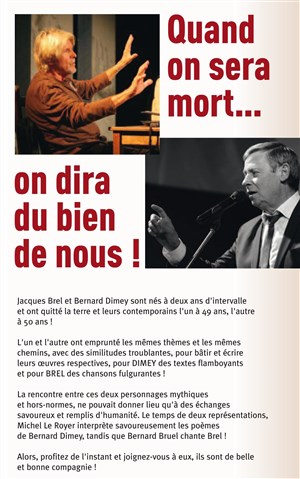La rencontre entre ces deux personnages mythiques et hors normes ne pouvait donner qu'à des échanges savoureux et remplis d'humanité. Le temps de quatre représentations, Michel le Royer interprète savoureusement les poèmes de Bernard Dimey tandis que Bernard Bruel chante Brel.