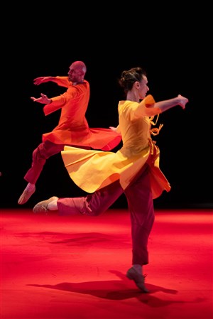 Le sol rouge devient instrument : glissés, tombés, frottés y résonnent, donnant à entendre la danse. Parfois en silence, parfois en fusion avec la musique, les corps dialoguent avec elle, la prolongent ou la précèdent. Sobres, les costumes révèlent les mouvements. La chorégraphie, pensée comme une partition, mêle unisson, canon, fugue, dans une architecture claire et polyphonique. Béatrice Massin s'empare du langage baroque pour en déployer l'esprit dans une écriture résolument contemporaine. Que ma joie demeure est une fête des sens, un moment suspendu où danse et musique ne font plus qu'un.