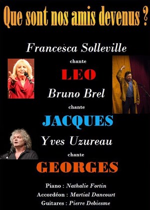 Brel, Brassens Ferré : Francesca Solleville chante Léo, accompagnée de Nathalie Fortin (piano), Bruno Brel chante Jacques, accompagné de Martial Dancourt (claviers et accordéon), Yves Uzureau chante Georges, accompagné de Pierre Debiesme (guitares).