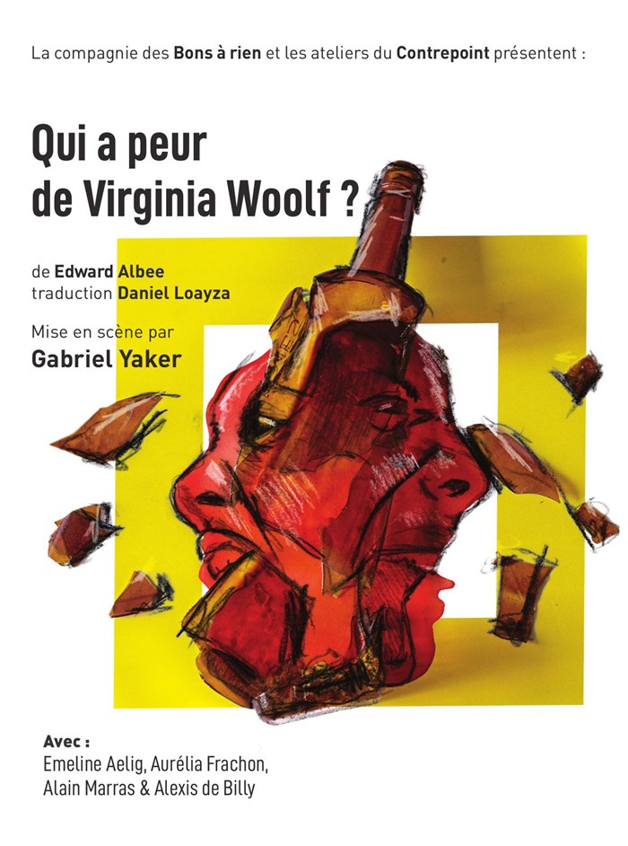 2h40 de pur régal!C'est à la fois la pièce la plus longue (en fait on ne voit pas le temps passer) et la plus mémorable que j'aie jamais vue.Tout ça grâce à la présence de 4 comédiens fantastiques qui nous promettent un moment très électrique dès l'entrée en scène de George (Alain Marras) et Martha (Emeline Aelig).Les invités de cette soirée très animée (arrosée), Nick (Alexis De Billy) et Honey (Aurélia Frachon),en prennent pour leur grade (pour notre plus grand plaisir) mais la pièce permet surtout d'explorer les fêlures et la déchéance du couple vieillissant. Ca se bouscule, ça se provoque, ça postillonne dans tous les coins (règlement de compte oblige).La pièce rappelle un bon Tennessee Williams et George (Alain) m'a rappelé à certains moments Stanley Kowalski (un tramway nommé Désir).C'est Bel et bien une pièce qu'on a forcément envie d'aller revoir...