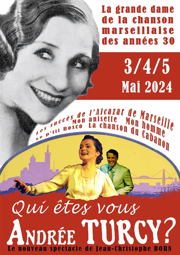 "A l'occasion des 50 ans de la disparition d'Andrée Turcy, grande dame de la chanson marseillaise, laissez-vous emporter par l'histoire vibrante de cette immense artiste. Un voyage à travers les cafés-concerts, les music-halls parisiens, l'Alcazar de Marseille, le Casino d'Alger, les grandes guerres... Évoquer Andrée Turcy, c'est réveiller l'âme de la Provence, du cabanon, de l'anisette, de l'amour et déclarer sa passion pour la chanson marseillaise. Plongez dans l'univers envoûtant d'une artiste légendaire, où chaque note résonne comme un hommage à son héritage immortel."