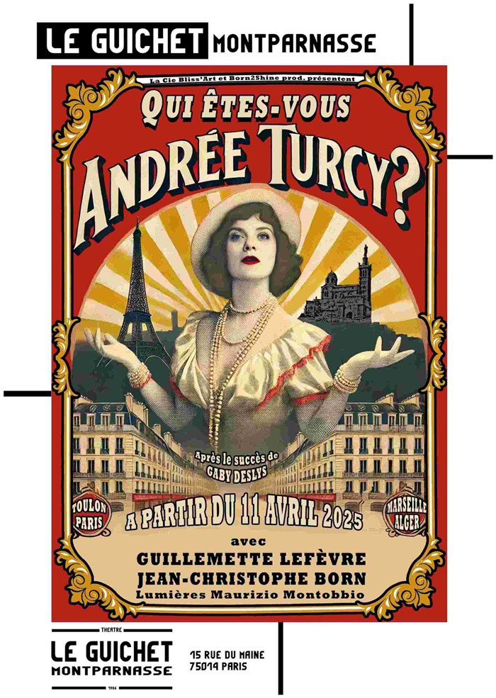 Il y a 50 ans, disparaissait Andrée Turcy, chanteuse réaliste qui connu un succès certain dans le premier tiers du XXe siècle. De l'Eldorado de Paris au Casino d'Alger en passant par l'Alcazar de Marseille, la pièce retrace le parcours de cette artiste de caractère qui fit de grandes tournées avec sa propre une troupe. Figure majeure de la vie Marseillaise, elle dirigea l'Alcazar et fit également quelques apparitions dans les films de Pagnol. La pièce met en scène la chanteuse interviewée par un journaliste de La Provence. Procédé qui permet de retracer sa vie et sa carrière et de faire entendre ses plus grands succès. Des photos et une vidéo de l'époque sont également projetées. Guillemette Lefevre qui interprète Andrée Turcy, est une chanteuse et une comédienne excellente. La qualité de ses interprétations dans ces deux "fonctions" sont bluffante. On finit presque par oublier qu'elle n'est pas vraiment Andrée Turcy. A ses côtés, Jean-Christophe Born, auteur et metteur en scène de la pièce, est également excellent dans le rôle du journaliste groupie, à la fois enjoué, ému et intimidé sanscrierart.com