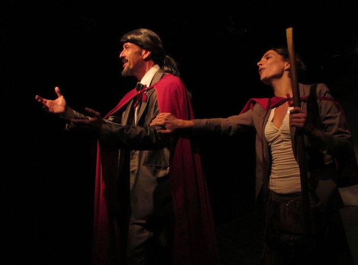 L'un se prend pour Don Quichotte de la Mancha, l'autre accepte malgré son évidente féminité d'être Sancho Panza. Ils caracolent, déambulent, hennissent, pourfendent, poursuivent d'impossibles chimères et sont tour à tour enfants, crapauds, rois et gueux. Un spectacle burlesque, absurde à la fois proche et lointain de l'oeuvre de Cervantes.