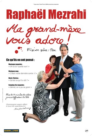Voir plusIl faut absolument aller voir "Ma grand-mère vous adore !" C'est un spectacle très drôle ! Je n'attend pas d'être grand-mère pour aimer Raphaël ! Raphaël Mezrahi est très très très fort pour faire ce que les autres ne font pas et on lui dit MERCI en l'applaudissant des 2 mains ! Les 30 minutes de vidéos inédites sont désopilantes...Quel génie ! Moi je pense qu'il devrait y avoir plus souvent du Mezrahi partout pour qu'on se marre vraiment ! Il dit s'emmerder???? Mais alors qu'il s'emmerde encore car nous ça nous fait vraiment rire ! La salle était pleine et tout le monde est sorti avec la banane comme dirait Renaud ! Puis finir avec une coupe de champagne végan (oui il vous expliquera et croyez moi c'est la toute grande classe!) à la sortie c'est un bonheur ! Bravo pour toutes ces vidéos on en redemande !!!! Tous les sketches sont très drôles et tellement décalés avec ce qui se fait partout !! BISOUS Sandy et ses grands-mères Lucienne et Ginette.