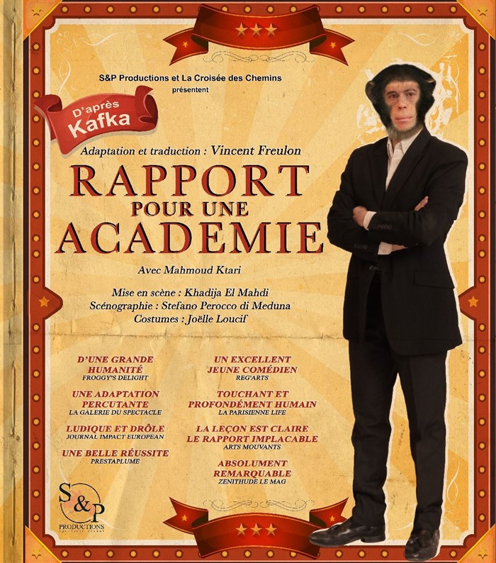 Un artiste sort de scène sous les vivats de la foule. Il court dans sa loge et se retrouve interpellé par un inattendu comité. "Comment avez-vous fait pour passer, en si peu de temps, de l'état de singe à celui d'être humain ? Nous avons besoin de votre témoignage pour établir un rapport..."