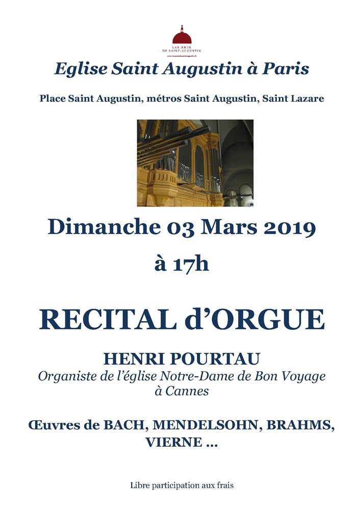 Henri Pourtau propose un récital d'orgue sur le grand orgue Cavaillé-Coll de St-Augustin. Visite de la tribune à l'issue du concert.