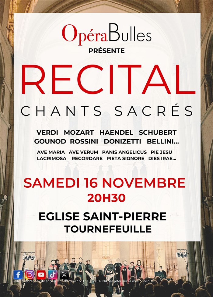La troupe OpéraBulles vous présente son nouveau récital de chants sacrés, mettant en lumière un nouveau répertoire riche en émotions.