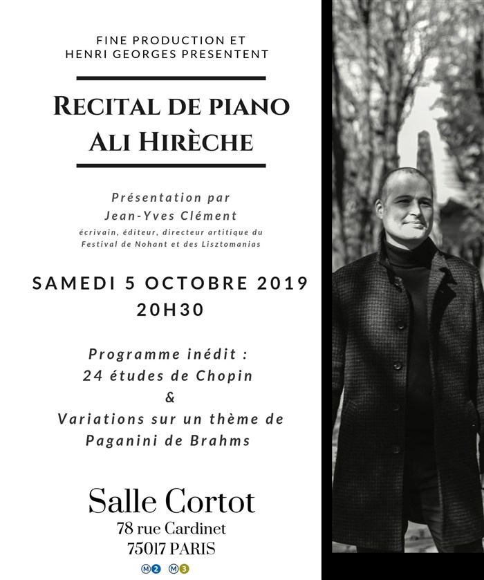 Fine Production et Henri Georges sont heureux de vous inviter à leur premier concert de la saison Salle Cortot pour un récital de piano d'Ali Hirèche
