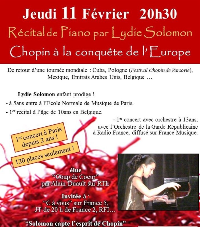 L’événement Récital de Piano : Chopin à la conquête de l'Europe : par Lydie Solomon de type Musique classique, organisé ici :