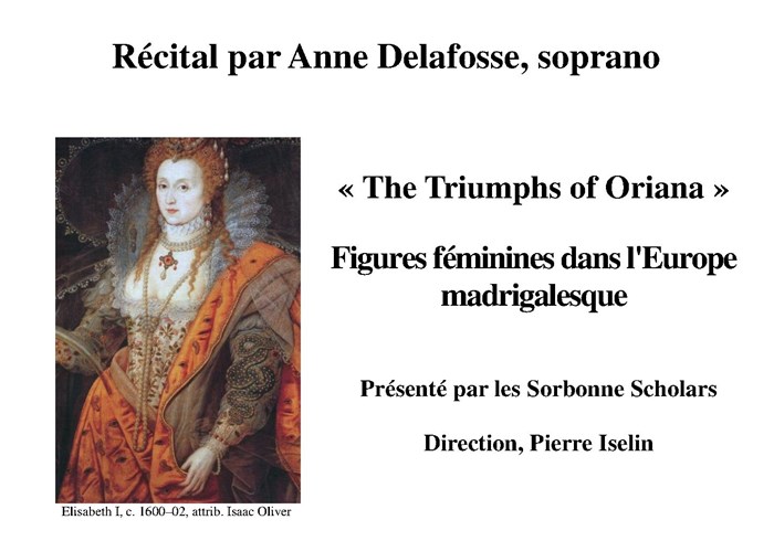 Ce concert emprunte son titre, "The Triumphs of Oriana", au recueil de vingt-cinq madrigaux rassemblés en 1601 par Thomas Morley en hommage à la reine Elizabeth Ière d'Angleterre. Plusieurs pièces de ce volume, par les madrigalistes anglais les plus en vogue, seront interprétées, ainsi que des madrigaux de William Byrd, Josquin des Prés, Claude le Jeune, consacrés aux figures bibliques ou mythologiques de Susanne ou de Didon.