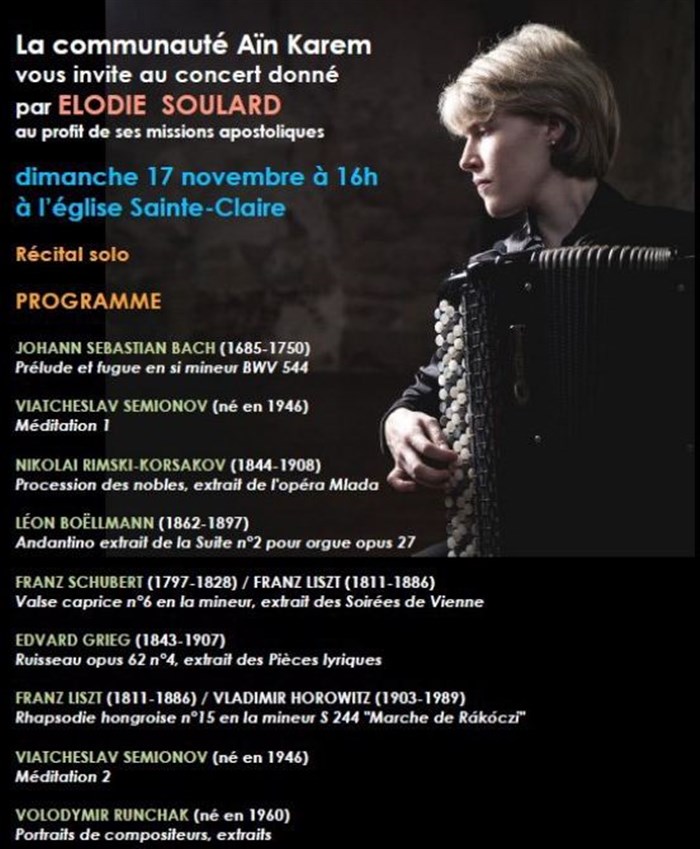 La communauté Aïn Karem vous invite au concert donné par Elodie Soulard au profit de ses oeuvres apostoliques.