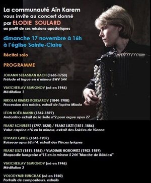 Tu veux savoir ce qu’ont pensé les spectateurs et la presse de cet événement : Récital solo d'Elodie Soulard à l'accordéon - Eglise Sainte Claire ? Découvre leurs avis éclairés et prépare-toi à vivre un moment d’exception à ton tour en réservant tes places !