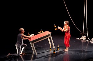 Jonas et Esther Slanzi mêlent éléments acrobatiques et méli-mélo de cordes, avec un jeu de diabolo au rythme infernal et des mimiques qui entraînent le public.