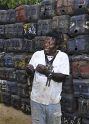 Né au Bénin en 1962, Romuald Hazoumè vit entre Cotonou et son atelier de Porto-Novo. Là, il entrepose des centaines de ces bidons d'essence qui servent au trafic de contrebande avec le Nigeria voisin, devenus pour l'artiste la métaphore de tout un peuple, à travers laquelle il a renouvelé l'art des masques. Hazoumè décode chaque signe figurant sur un bidon, notamment par le biais du vaudou. De même, il étudie le langage des coiffes de poupées yoruba qu'il collectionne. C'est dire que l'artiste oeuvre en initié. Il a travaillé comme un véritable chercheur sur le fa, ensemble de règles divinatoires et système où cosmogonie et philosophie constituent les fondements du savoir.