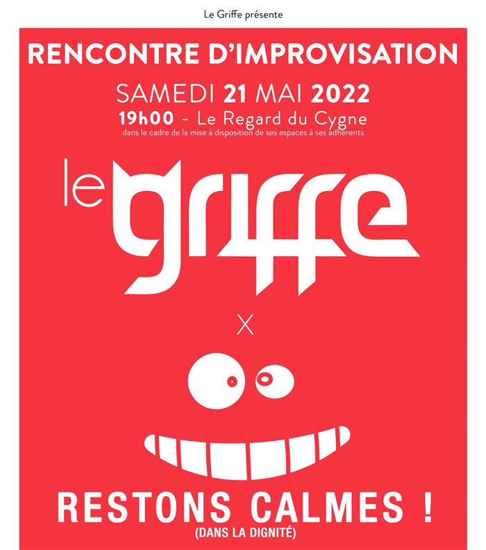 Pour sa deuxième rencontre de l'année au Regard du Cygne, le Griffe invite la belle troupe bordelaise des Restons Calmes pour improviser ensemble, dans le calme, la dignité mais aussi dans un tourbillon de folie !