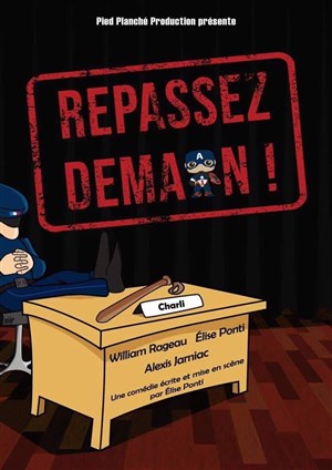 Autant prévenir tout de suite, vous ne verrez pas de blague pouet-pouet mais des situations beaucoup plus subtiles, des personnages drôles mais sincères, un rythme assez dynamique et tout ça sur un sujet assez délicat. Elise Ponti nous emmène avec folie dans son univers décalé accompagné par la fibre comique de William Rageau et l'inépuisable énergie d'Alexis Jarniac. Le sujet majeur ô combien délicat est traité avec légèreté et une certaine sincérité sans jamais être moqué ou vulgarisé. Je n'ai pas eu de fous rire mais j'ai eu de l'empathie pour le personnage de Cerise (incarné avec un naturel certain par Elise Ponti), j'ai souri plusieurs fois à la nonchalance de Charli et rigolé à la maladresse abusive de Monsieur Pierre Céstor :) Je conseille vivement cette pièce, elle ne plaira pas forcement à tous le monde mais elle mérite d'être vu pour le coeur qui y ai mis et le sujet traité avec conviction et sincérité. Je me ferai un plaisir de la revoir quand la pièce aura du vécu (c'était la deuxième lors de mon passage). Long vie à "Repassez demain".