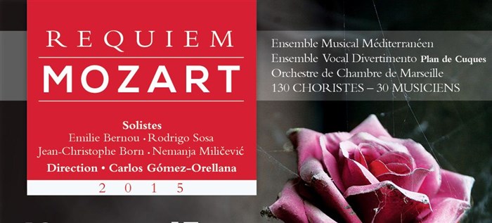 Chef de choeur et d'orchestre Vénézuelien formé à Aix en Provence en musique ancienne et direction de choeur, Carlos Gómez-Orellana dirige les 120 choristes de l'Ensemble Musical Méditerranéen de Marseille et de l'Ensemble Vocal Divertimento de Plan de Cuques, 30 musiciens de l'Orchestre de Chambre de Marseille et les solistes Emilie Bernou (soprano), Rodrigo Sosa (contre-ténor), Jean-Christophe Born (ténor) et Nemanja Miličević (basse) pour interpréter dans toute sa force et sa splendeur cette oeuvre célébrissime, riche d'émotions intenses, ultime création de Mozart vers l'éternité du repos et de la lumière.